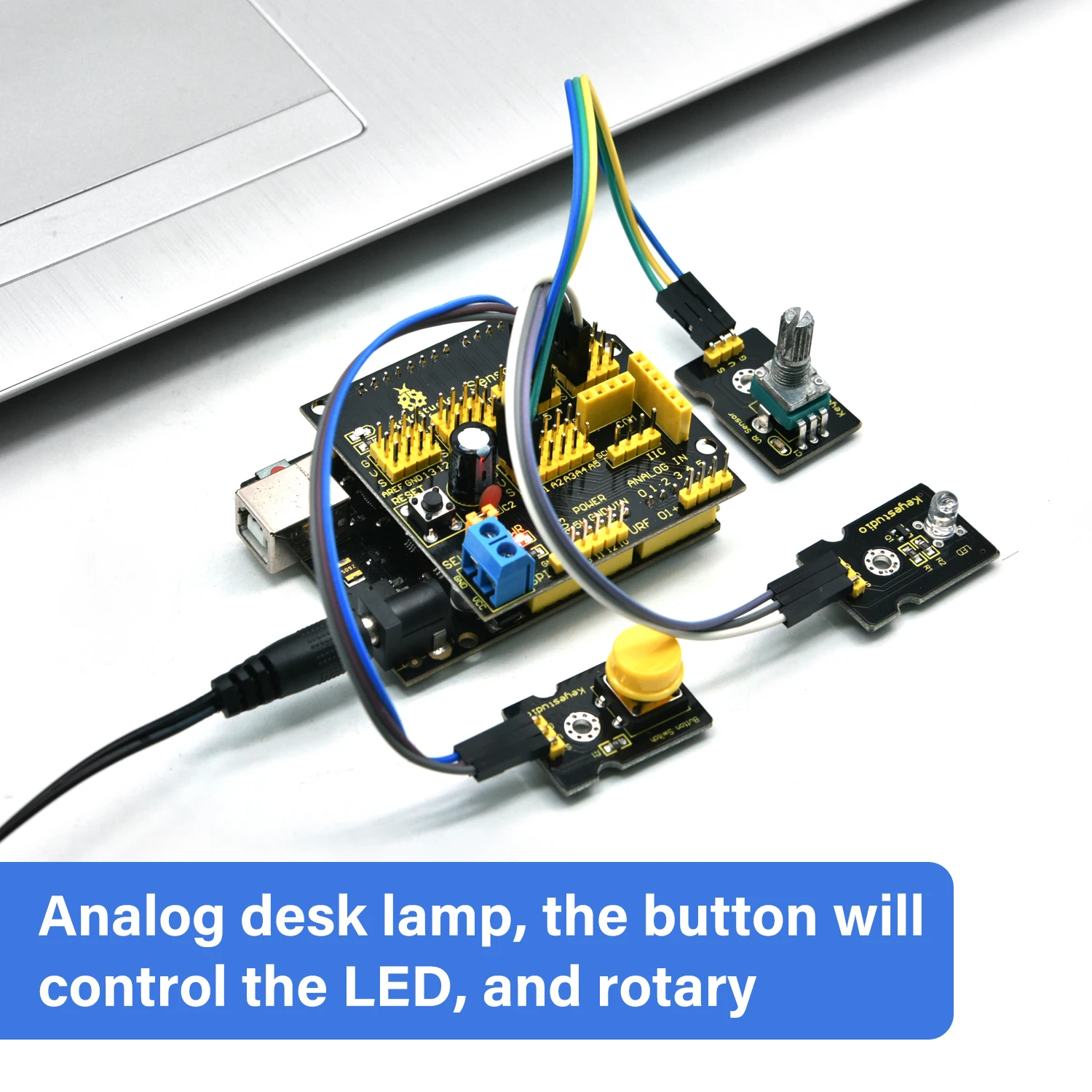 Inside this box, there are digital and analog sensors, and also some special modules such as ultrasonic, Joystick, relay, acceleration modules, etc.